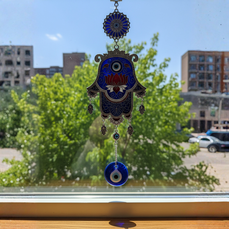 Dije Mano de Fátima turquesa con stras de acero quirúrgico