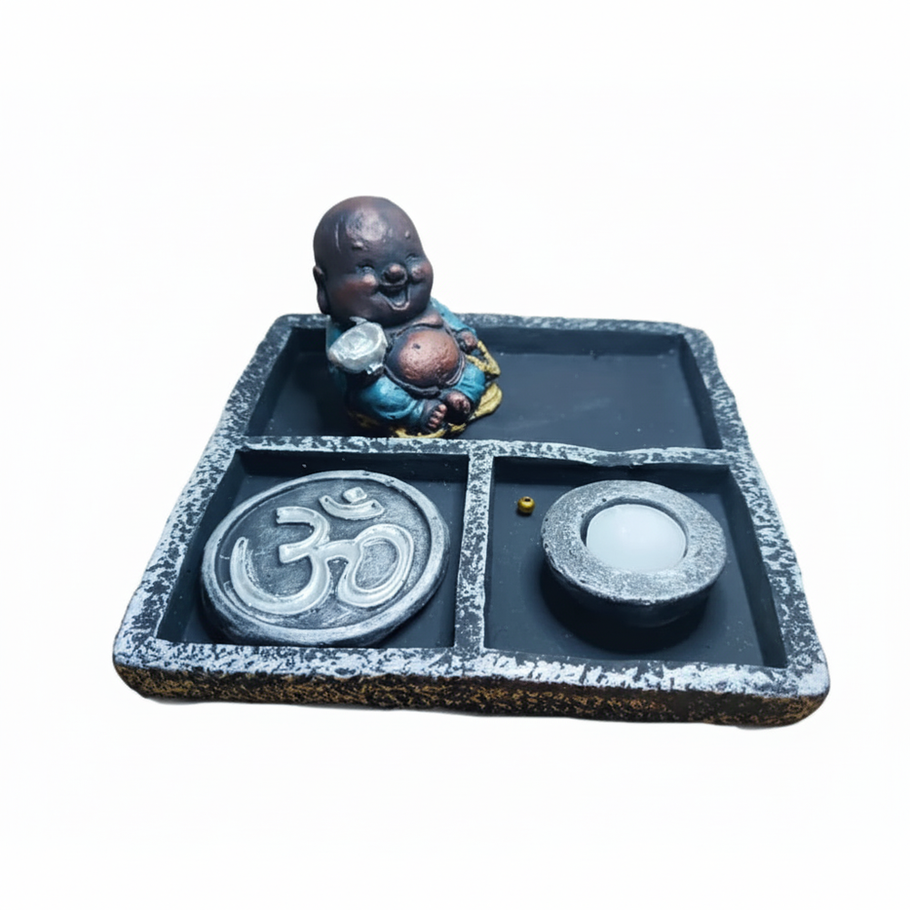 Diseño: Base rectangular con figura de Buda bebé, símbolo Om y espacio porta vela