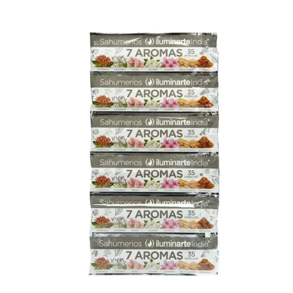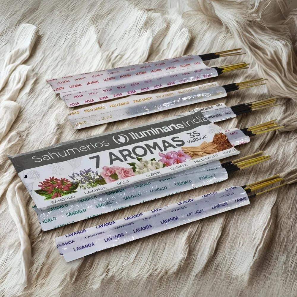 Cada blister incluye 35 varillas distribuidas en 7 fragancias diferentes: Sándalo, Lavanda, Rosa, Jazmín, Champa, Palo Santo e Incienso. Aromas intensos, naturales y duraderos que se adaptan a cada estado de ánimo y necesidad.