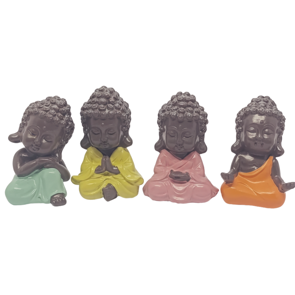 Un conjunto único de 4 mini budas en resina poliéster, cada uno con túnicas de colores diferentes y posturas que transmiten paz, armonía y espiritualidad. Ideales para decorar hogares, oficinas o rincones de meditación, aportando energía positiva y un estilo encantador.