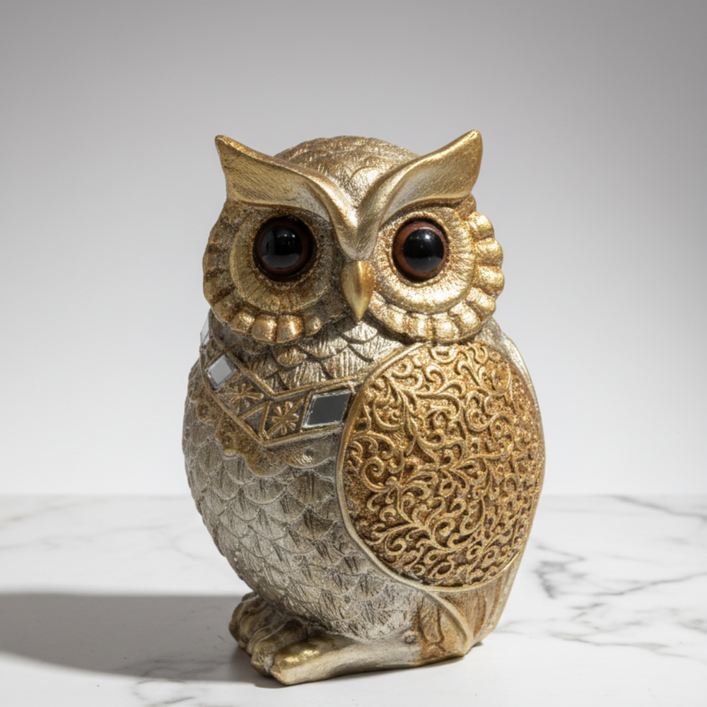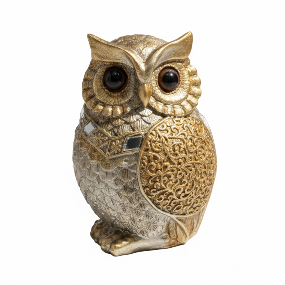Un adorno elegante y lleno de simbolismo. Este búho dorado decorativo no solo destaca por su brillo y detalles en relieve, sino que también representa sabiduría, protección y buena fortuna, convirtiéndolo en una pieza ideal para el hogar, la oficina o como regalo especial.