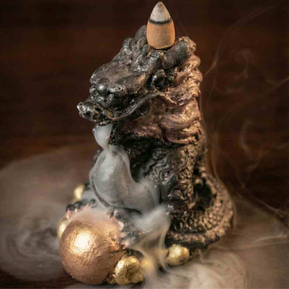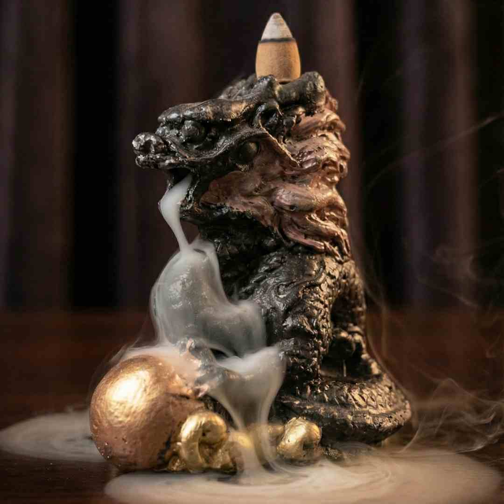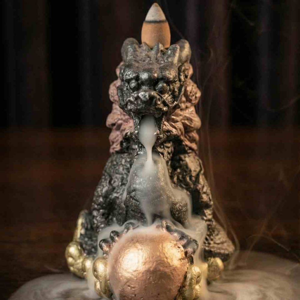 Añade un elemento de decoración fascinante a tu hogar u oficina con este quemador de incienso tipo cascada. Con un diseño intrincado, este portaincienso representa a un dragón posado sobre una base decorada, sosteniendo una prominente esfera de color cobre.