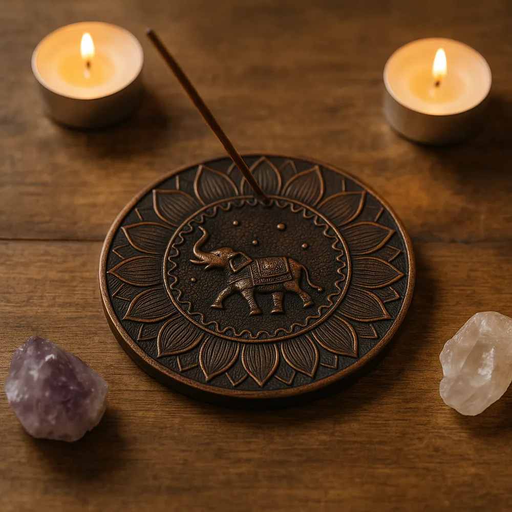 Portasahumerio decorativo con diseño de elefante hindú, símbolo de sabiduría, fuerza y buena fortuna. Elaborado en resina resistente, con terminación bronce envejecido y detalles tallados que le dan un aspecto artesanal y elegante.