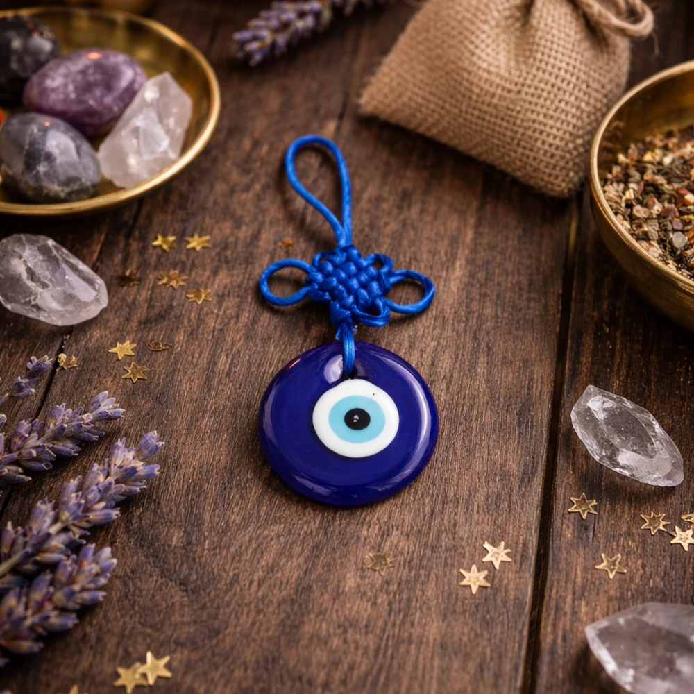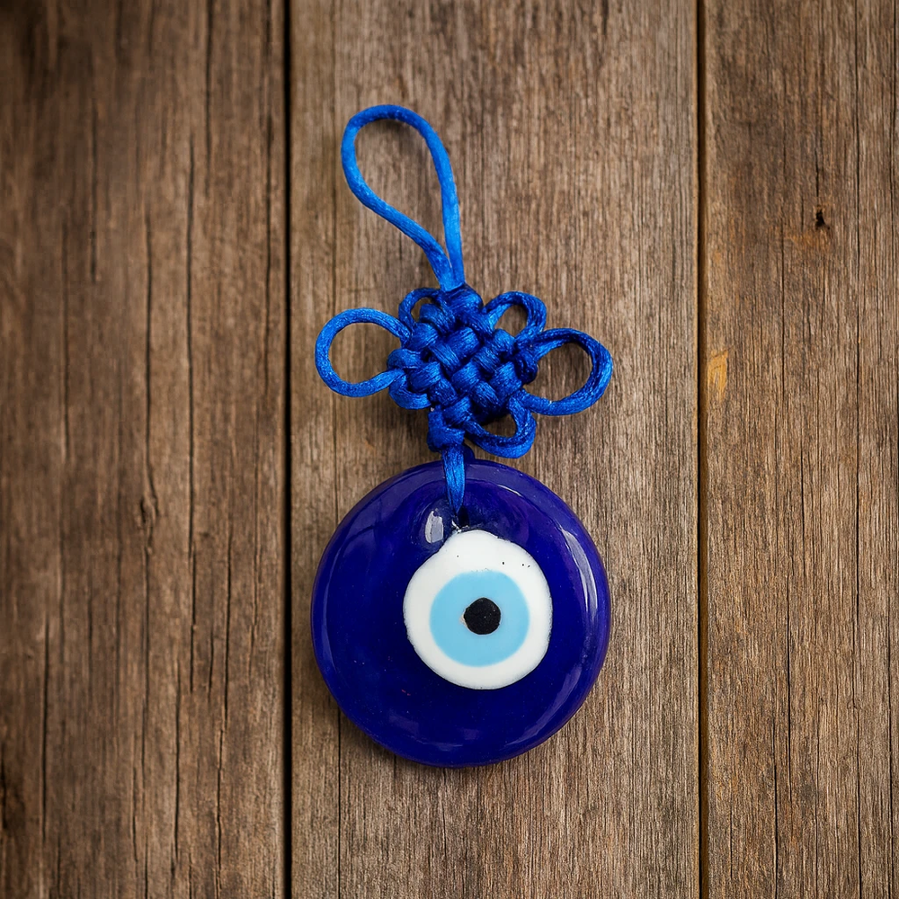 Ideal para colgar en puertas, autos, mochilas, carteras o incluso como un regalo significativo. Su diseño artesanal en vidrio azul con cordón tejido lo convierte en un amuleto versátil, llamativo y con un profundo valor cultural.