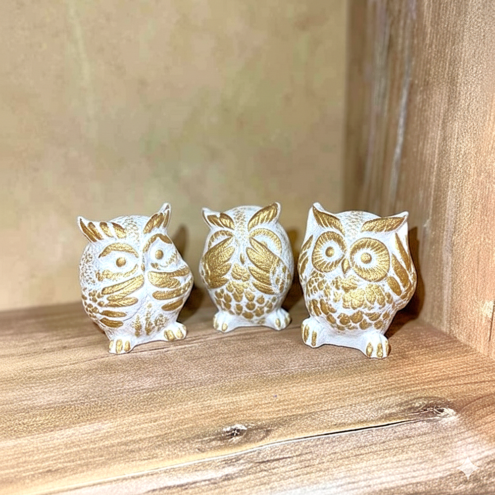 Estas lechuzas decorativas “Ciego, Sordo y Mudo” de 10 cm son un clásico infaltable para cualquier tienda de artículos místicos o decoración. Su acabado en tonos blanco y dorado crea un efecto elegante y luminoso, ideal para resaltar en estanterías, mesas de exhibición y espacios zen.