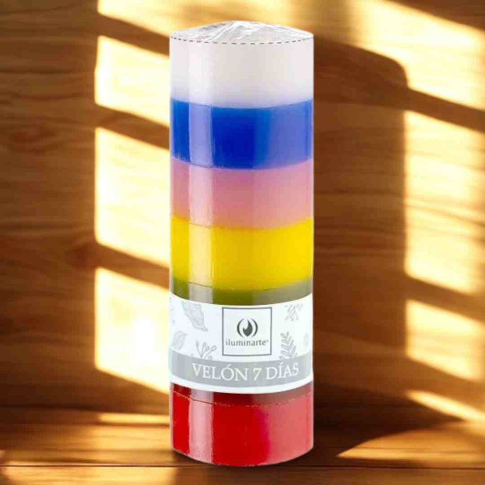 Velón 7 Días 7 Colores El Velón 7 Días es un elemento esencial para tus rituales y prácticas espirituales. Este velón, disponible en siete colores, está diseñado para acompañarte en tus intenciones y deseos, brindando una luz especial que potencia cada momento.