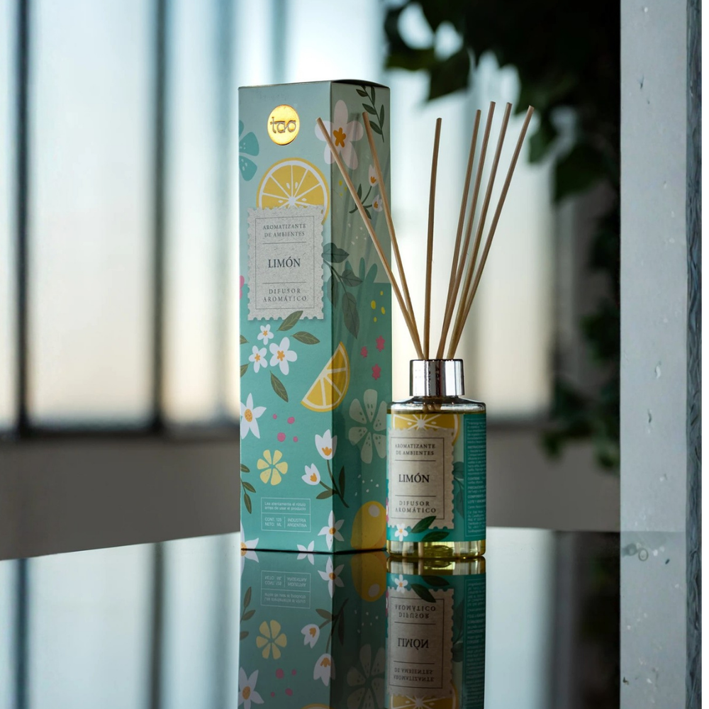 Incluye varillas difusoras de fibra vegetal para una difusión continua y uniforme.
