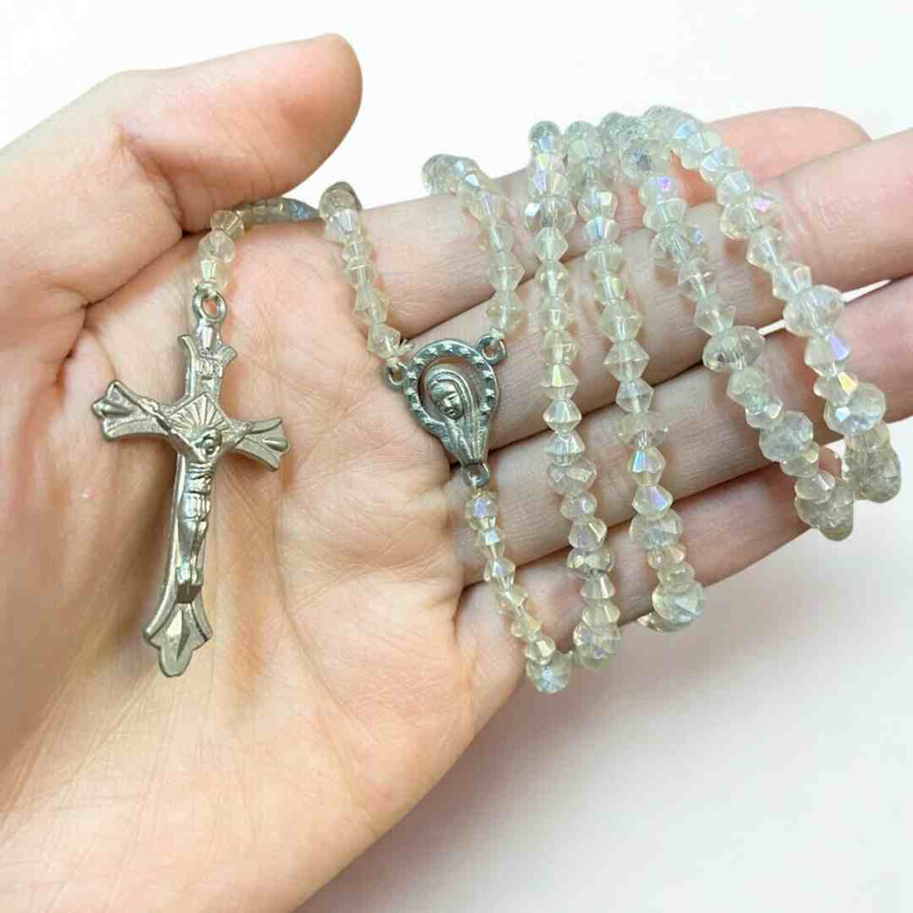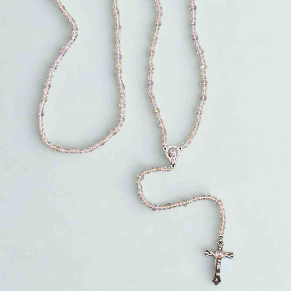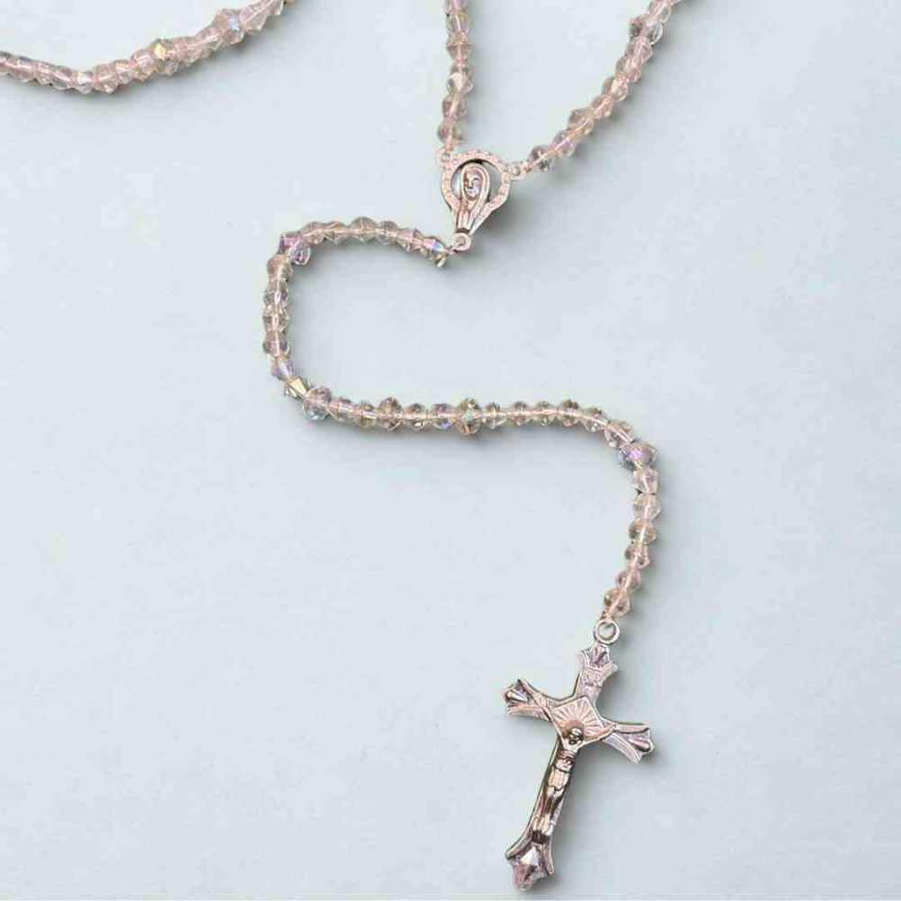 "Rosario con cuentas cristalinas y cruz metálica, ideal para la oración y momentos de meditación. Su diseño delicado lo convierte en un accesorio espiritual y un regalo significativo."