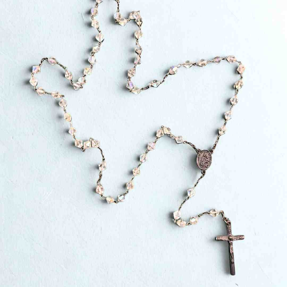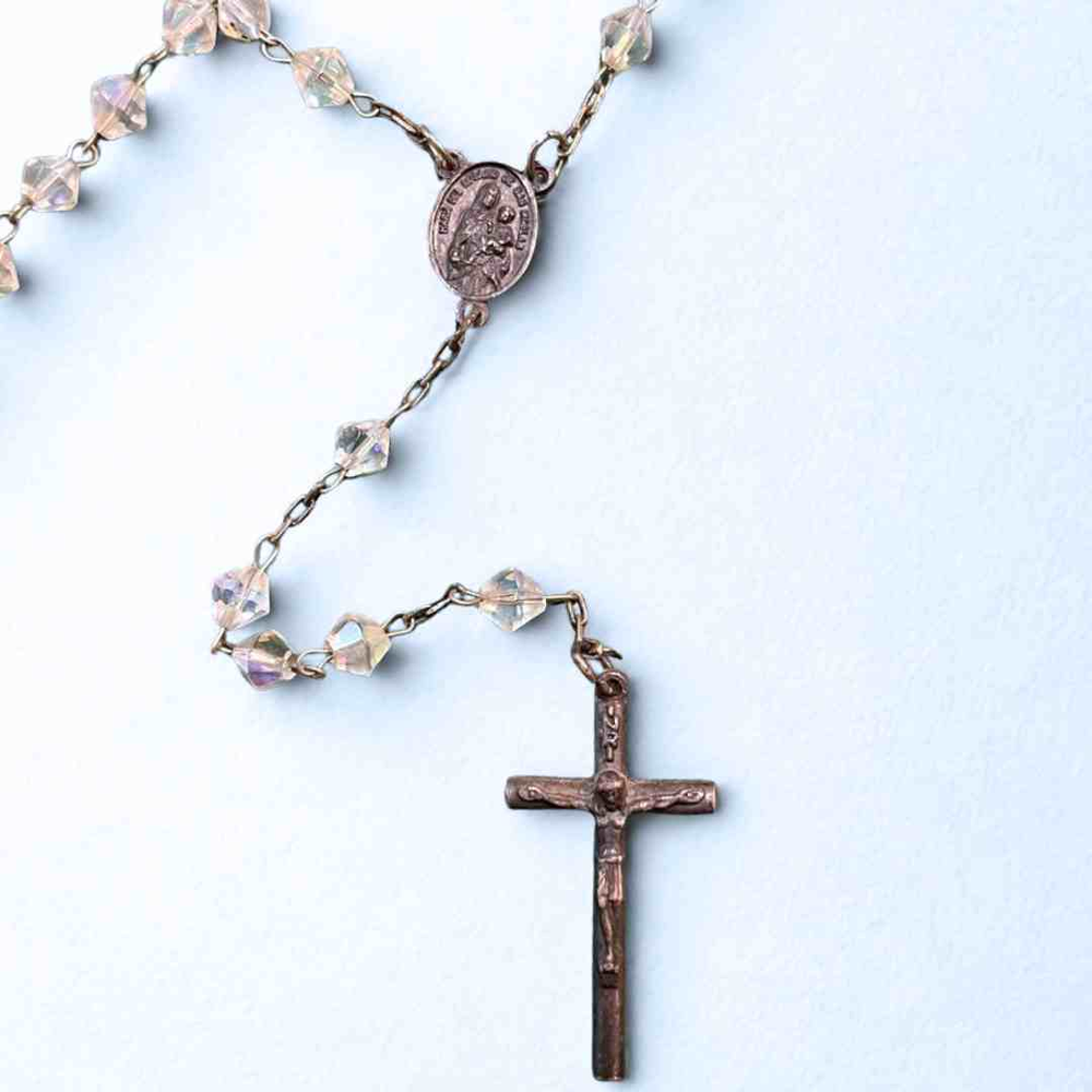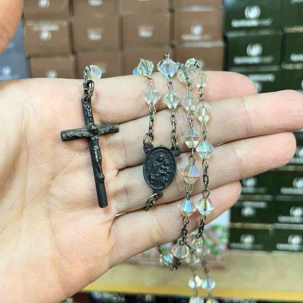 "Rosario acrilico con cuentas facetadas y cadena metálica, acompañado de cruz y medalla detalladas. Perfecto para momentos de oración, meditación y como símbolo de fe."