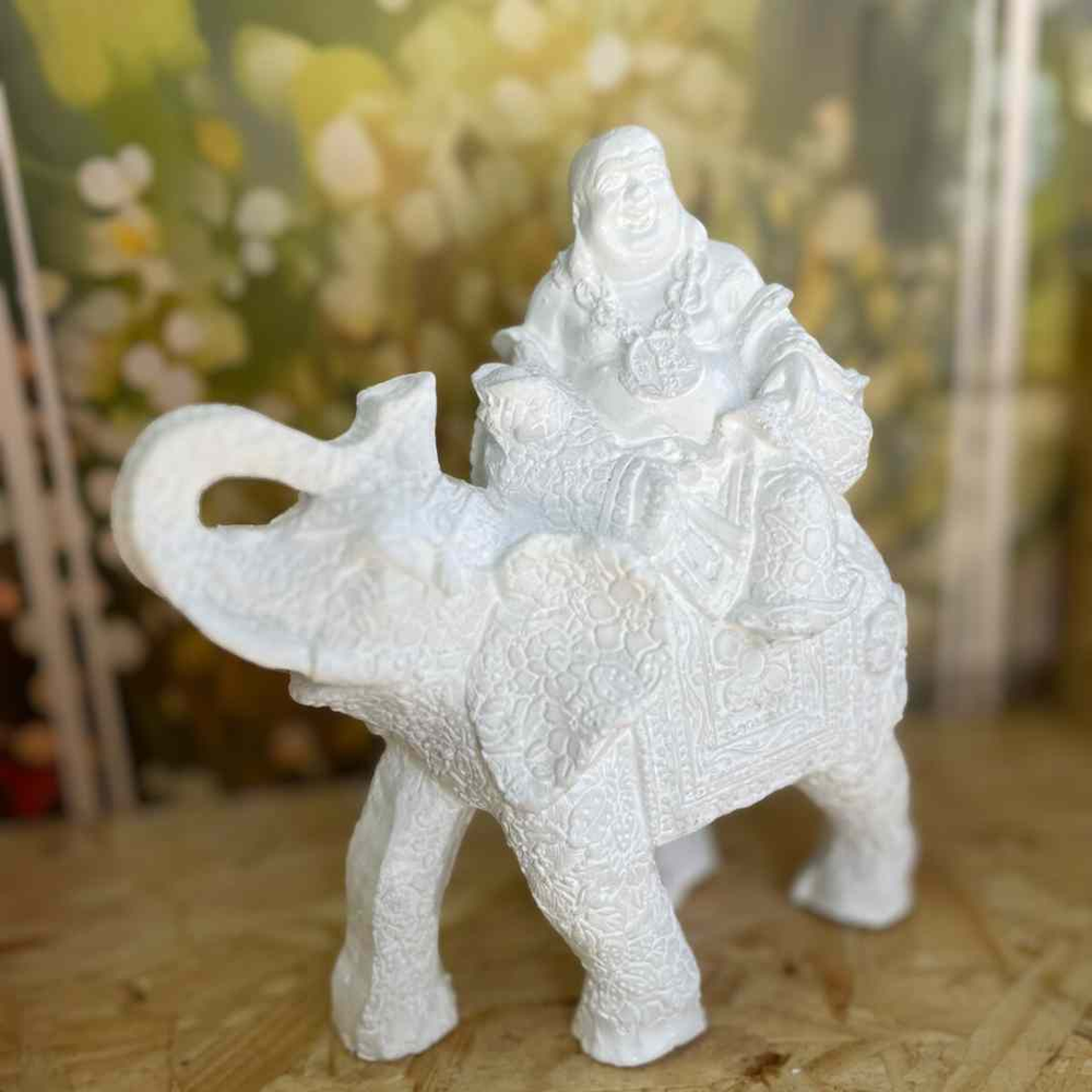 Figura artesanal en yeso blanco decorativo, que representa al Buda de la Fortuna montado sobre un elefante. El elefante simboliza fuerza, sabiduría y estabilidad, mientras que el Buda aporta alegría, prosperidad y abundancia.