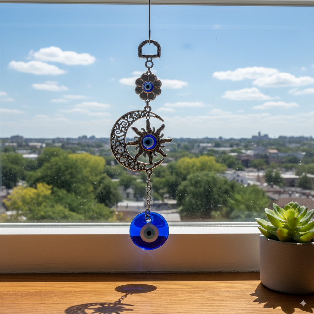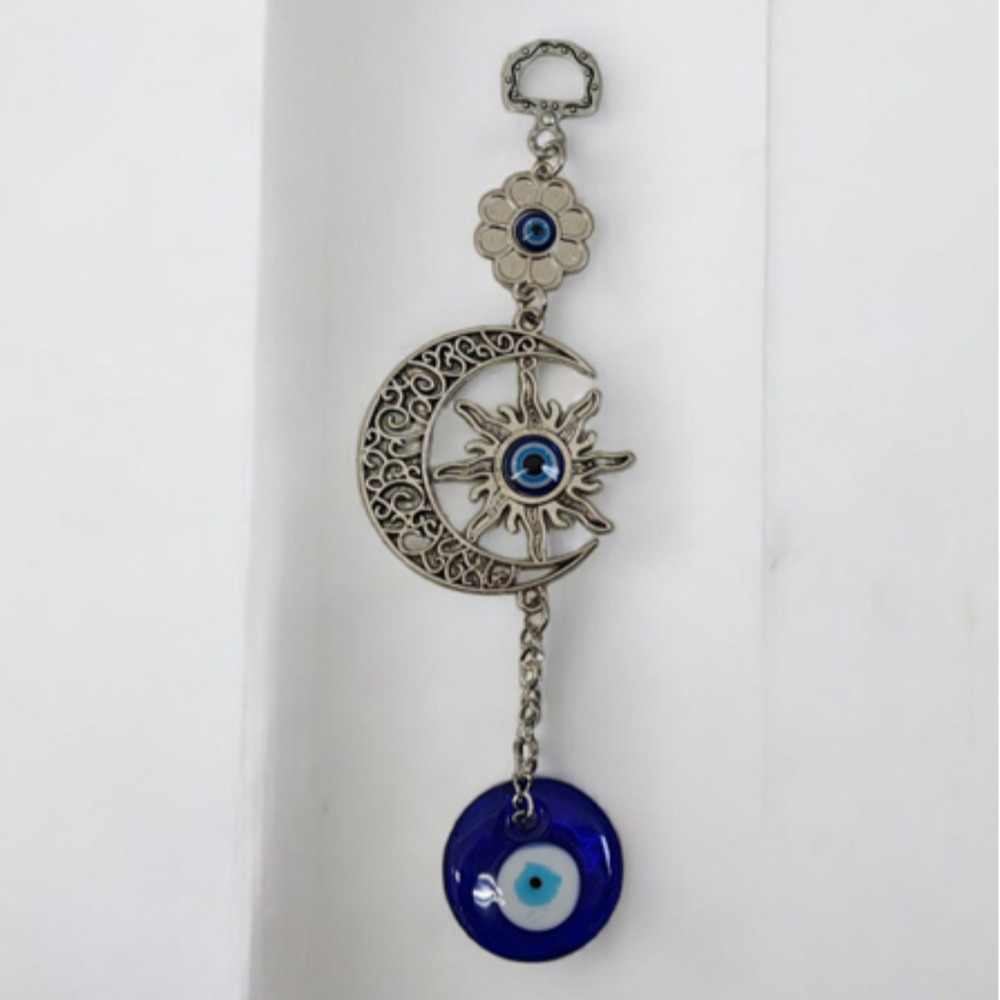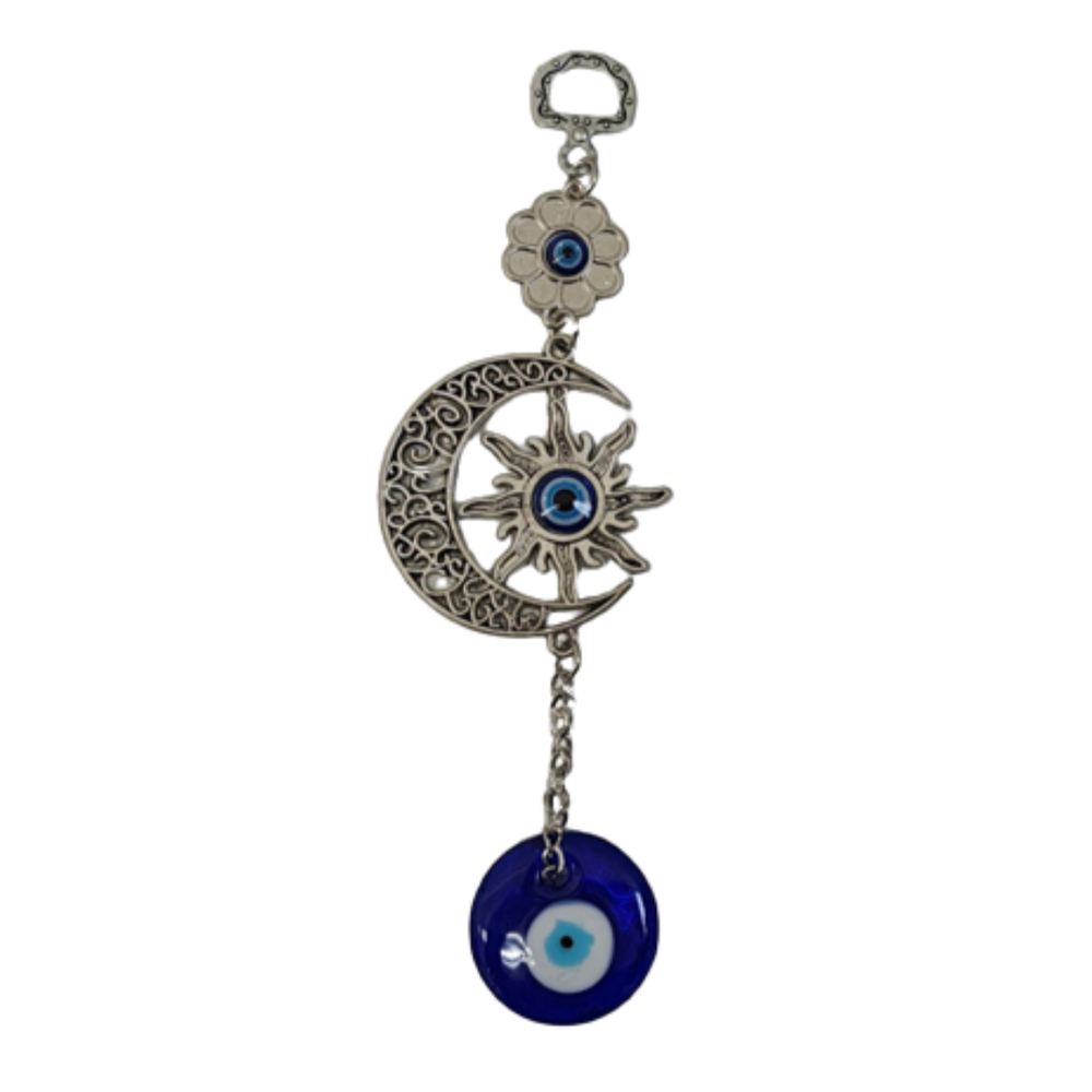 Dale un toque de protección y estilo a tus espacios con este hermoso colgante. El diseño combina la luna y el sol, símbolos de energía y equilibrio, con el clásico ojo turco azul, reconocido por atraer buenas vibras y alejar las malas energías.
