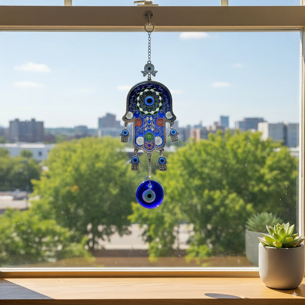 Un amuleto único que fusiona la protección espiritual con un diseño lleno de color y detalles. La Mano de Fátima simboliza fuerza y resguardo, mientras que el Ojo Turco atrae energías positivas y aleja las malas vibras. Su decoración con motivos florales lo convierte en una pieza no solo protectora, sino también altamente decorativa y atractiva para cualquier espacio.