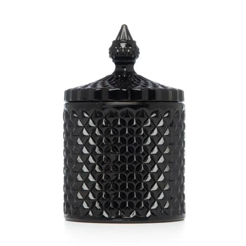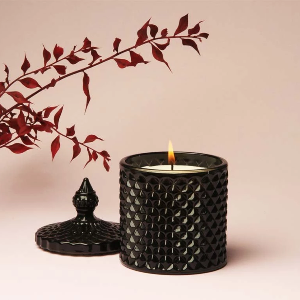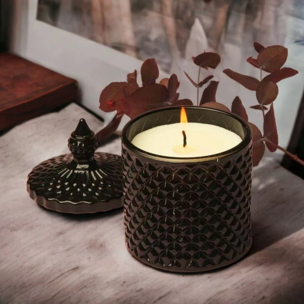 Vela aromática en recipiente de vidrio tallado tipo caramelera.