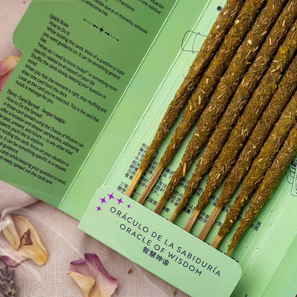 Un oráculo con 12 cartas esperando ser reveladas: cada caja contiene una carta sorpresa que trae consigo un mensaje único. Los sahumerios en su interior acompañan la experiencia, expandiendo el sentido con fragancias que elevan y sostienen.