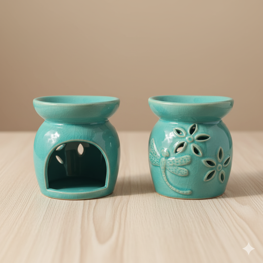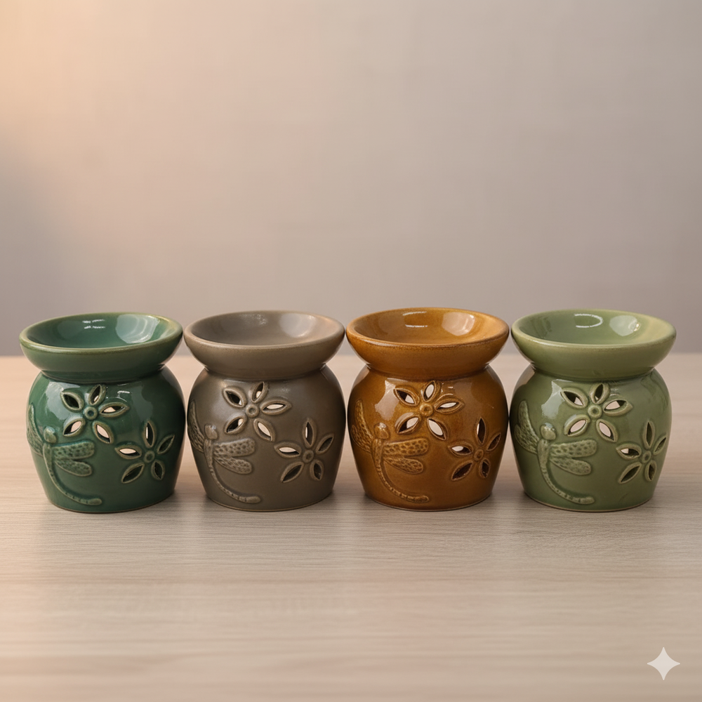 Un diseño delicado que combina belleza natural y relajación aromática. Este hornito de cerámica esmaltada con detalles de libélulas y flores es ideal para quienes buscan decorar y perfumar su hogar con un toque de encanto artesanal.