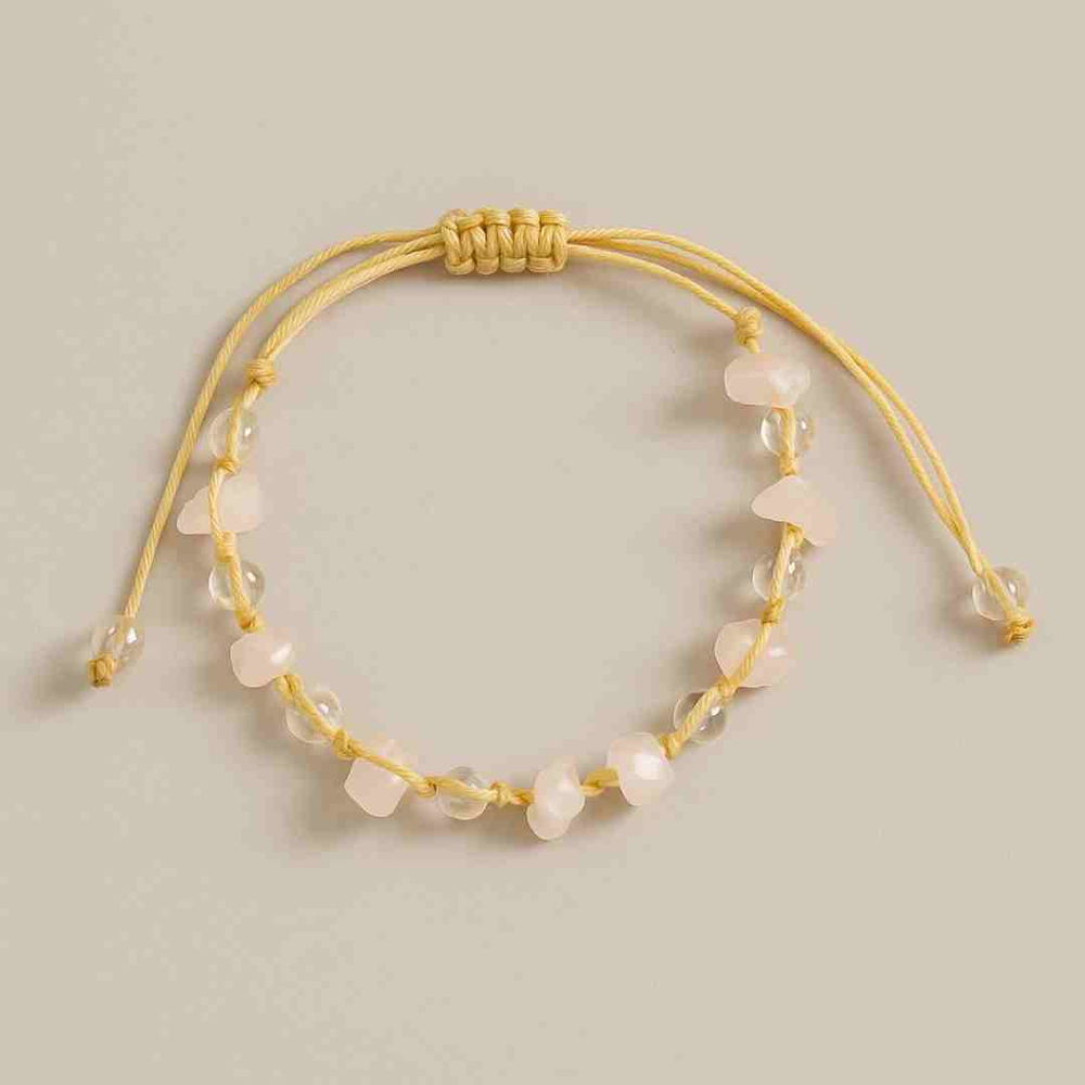 Delicada y encantadora, esta pulsera de cuarzo rosa natural irradia dulzura y equilibrio. Hecha a mano con escallas de piedra y un hilo dorado ajustable, combina la elegancia natural con un diseño artesanal lleno de intención.