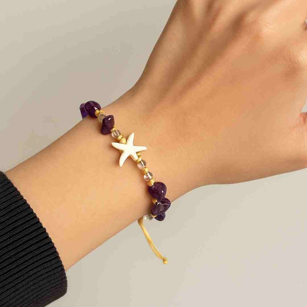 Conectá con tu energía más serena con esta pulsera artesanal de amatista natural, elaborada con escallas irregulares que realzan su belleza única. Su tono violeta profundo transmite armonía y elegancia, mientras que el hilo dorado y el charm en forma de estrella le aportan un toque boho y sofisticado.