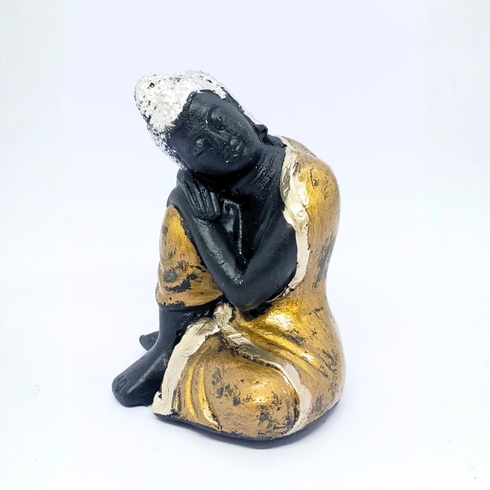 Con un acabado artesanal en tonos negro, dorado y blanco envejecido, esta figura combina elegancia y espiritualidad, perfecta para decorar hogares, oficinas o espacios de meditación. Su tamaño compacto permite colocarla en estanterías, escritorios o altares sin ocupar mucho espacio.