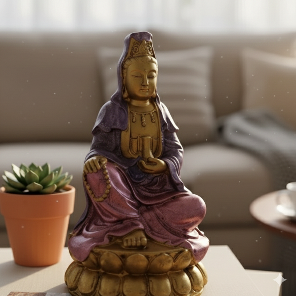 Confeccionada en resina pintada a mano y acabados en tonos dorados y violetas, esta figura transmite elegancia y serenidad. Su tamaño imponente la convierte en una pieza central perfecta para altares, salas de meditación o decoración del hogar, aportando un toque de espiritualidad y belleza oriental.