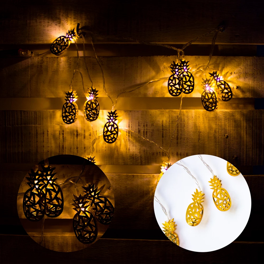 🍍 GUIRNALDA LED DE ANANÁ METÁLICA X10 – LUZ CÁLIDA DECORATIVA ✨🌴 ¡Dale un toque tropical y moderno a tus espacios! Esta guirnalda LED con diseño de ananá metálico combina estilo y luminosidad para crear ambientes únicos y llenos de encanto. Ideal para decorar fiestas, habitaciones, terrazas o escaparates, su luz cálida aporta una sensación acogedora y festiva al mismo tiempo. Cada ananá está fabricado en metal dorado con diseño calado, permitiendo que la luz se filtre de forma suave y elegante. Funciona a pilas, lo que te permite colocarla donde quieras sin preocuparte por enchufes ni cables molestos. 🌟 Perfecta para quienes aman los detalles originales y con onda veraniega. Características principales: