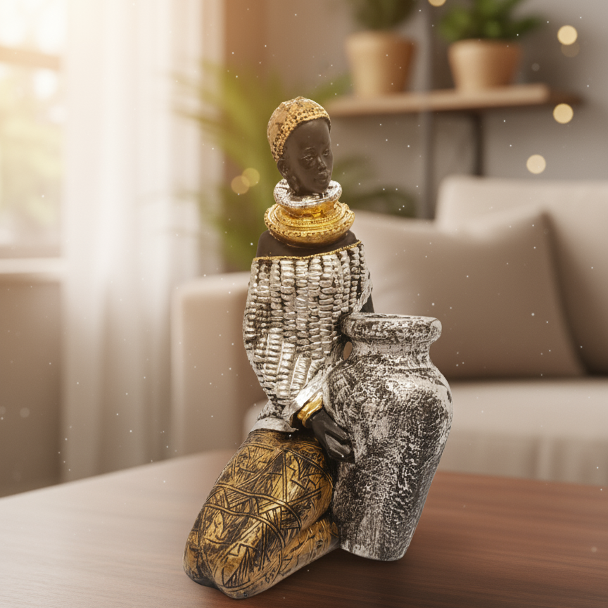 Elegancia artesanal con inspiración africana. Esta figura decorativa de una mujer africana combina detalles en tonos plateado y dorado envejecido, creando una pieza de alto impacto visual que aporta calidez y distinción a cualquier ambiente. Su acabado texturado y su diseño cuidado la convierten en una excelente opción para decoración de interiores, vidrieras o como regalo original.