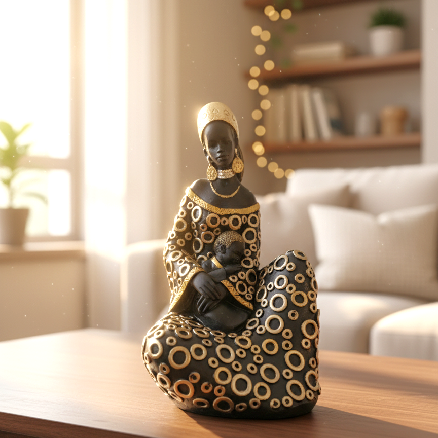 Una obra que transmite amor, cultura y elegancia. La Imagen Mamá e Hijo Africanos representa la unión maternal y la belleza de la tradición africana. Su diseño artesanal, con detalles en negro, dorado y plateado, combina texturas y relieves que la convierten en una pieza decorativa única y sofisticada.