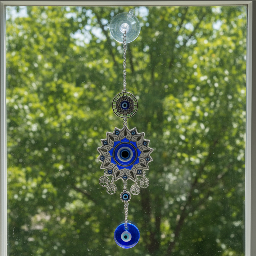 Diseño: Mandala central con múltiples Ojos Turcos y detalles colgantes
