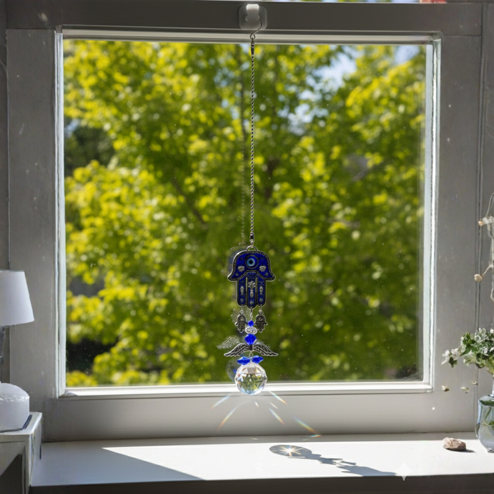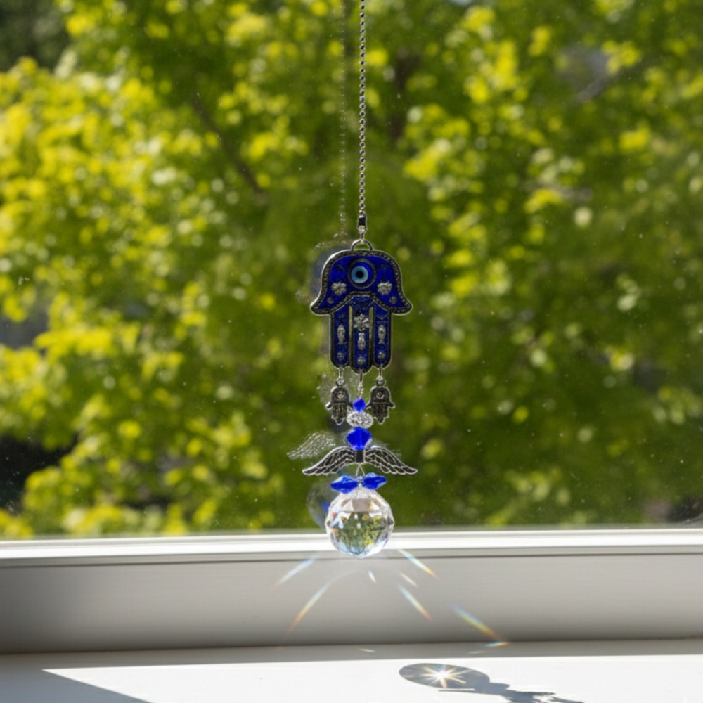 En la parte inferior incorpora pequeñas manos colgantes, cuentas decorativas azules y un hermoso ángel metálico, que sostienen una esfera de cristal facetado capaz de reflejar la luz de manera brillante, creando un efecto tipo atrapasol perfecto para ventanas, balcones o ambientes interiores. Es un producto de alta rotación, muy buscado en tiendas místicas, esotéricas, de decoración espiritual y regalerías. ¡Ideal para sumar a tu catálogo y asegurar ventas constantes!