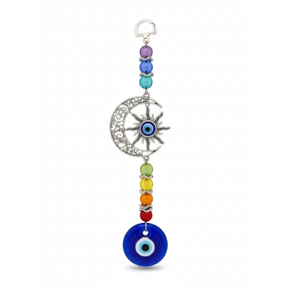 El Colgante Sol y Luna con Ojo Turco y cuentas de colores es una pieza decorativa vibrante y llena de energía, ideal para quienes buscan protección, armonía y un toque de color en sus espacios. Su diseño combina una luna calada de estilo artesanal con un sol central que incorpora un Ojo Turco azul, símbolo de resguardo y buena fortuna.