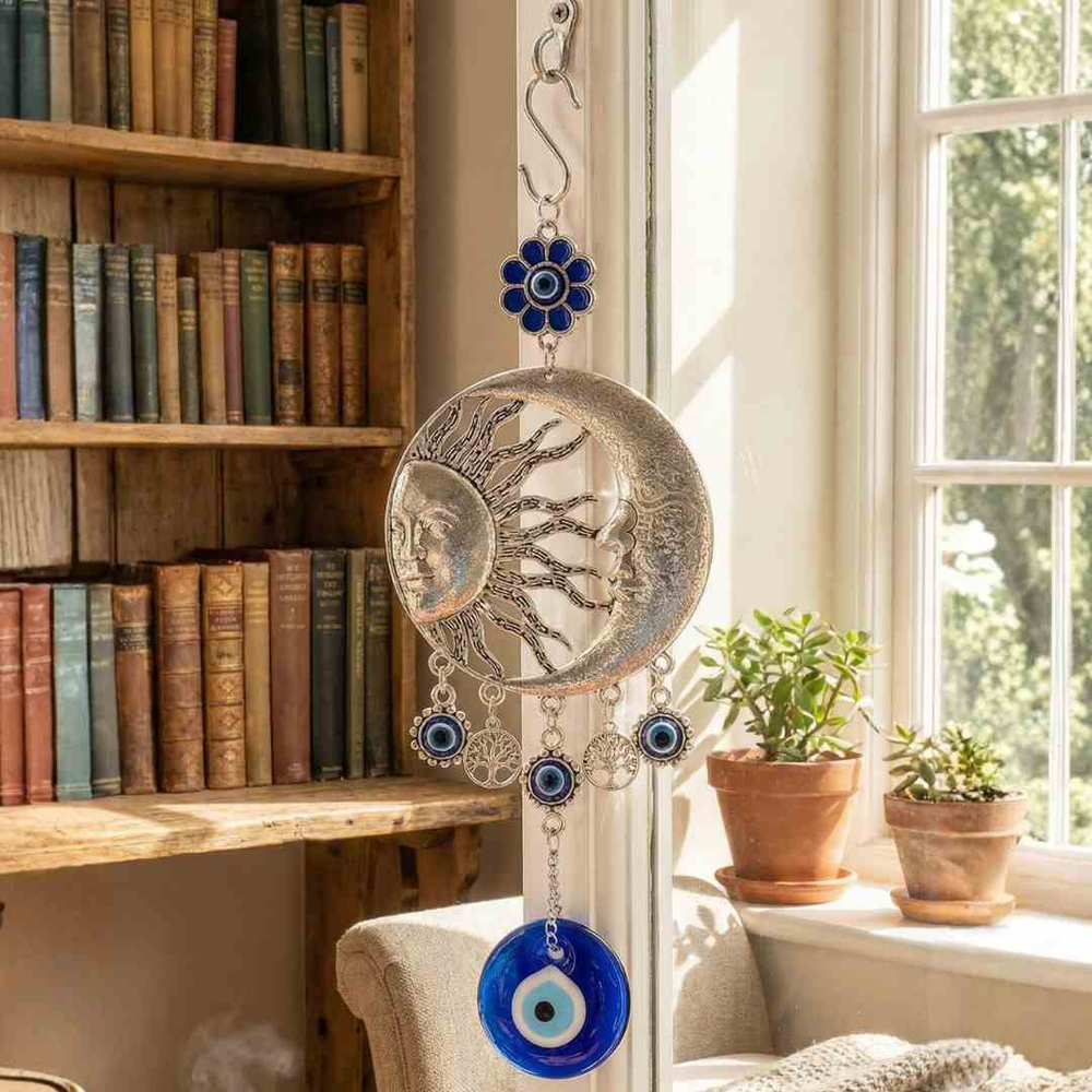 El Colgante Grande Sol y Luna con Ojo Turco es una pieza decorativa imponente, ideal para quienes buscan protección, energía positiva y un toque místico en sus espacios. Su diseño metálico en tono plata destaca por la figura del Sol y la Luna fusionados, representando equilibrio y armonía. En el centro, el clásico Ojo Turco azul refuerza la protección contra energías negativas.