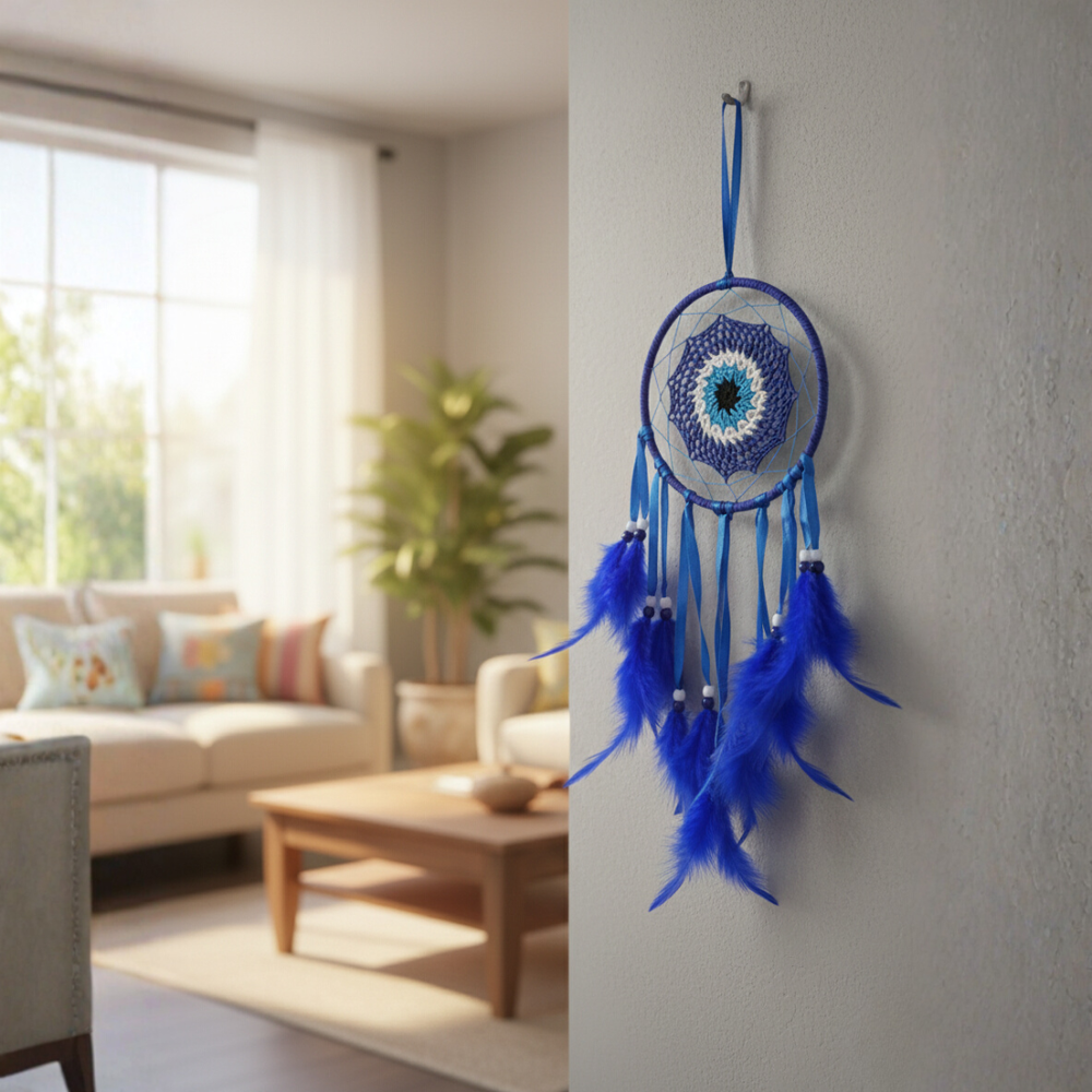 Las plumas suaves en tonos azul intenso y las cintas decorativas aportan movimiento y un acabado artesanal muy atractivo, convirtiéndolo en una pieza ideal para dormitorios, entradas, oficinas o cualquier rincón especial del hogar. Es un producto liviano, económico y de alta rotación, perfecto para tiendas místicas, regalerías y comercios de decoración espiritual.