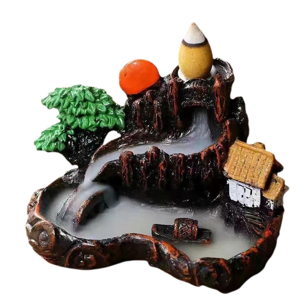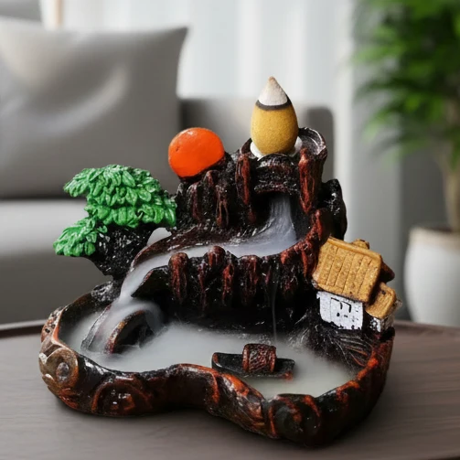 Al colocar un cono backflow en la parte superior, el humo desciende formando una suave cascada de niebla, recorriendo los canales hasta llegar a la base, creando un efecto mágico y muy atractivo para la vista. Es un producto de alta rotación, ideal para clientes que buscan decoración mística, relajación o una pieza especial para aromaterapia.