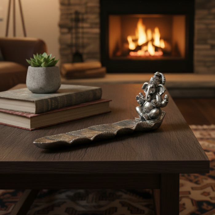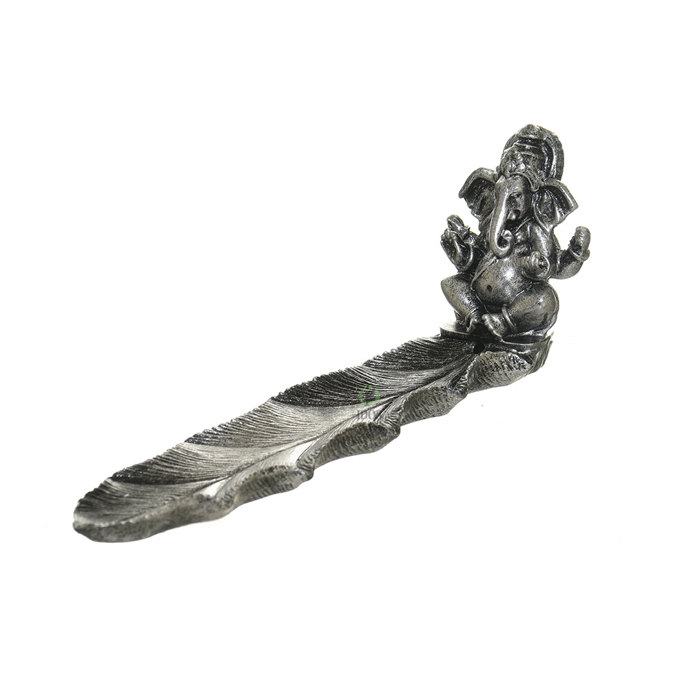 El Portasahumerio Ganesha Plateado es una pieza elegante y simbólica, ideal para quienes buscan armonizar sus espacios con energías positivas. Su diseño presenta a Ganesha, el reconocido dios hindú de la prosperidad y la eliminación de obstáculos, sentado al inicio de una base con forma de pluma detallada, donde se apoya el sahumerio.
