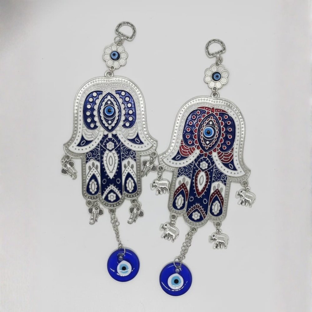 Los detalles en arabescos aportan un estilo elegante y artesanal, mientras que el colgante inferior de vidrio azul intensifica la protección y realza la estética del conjunto. Disponible en dos variantes de color (azul y rojo), es perfecto para entradas, livings, habitaciones o cualquier espacio donde se desee armonía y decoración mística. Es un producto de alta rotación, ideal para tiendas místicas, regalerías y comercios de decoración espiritual.