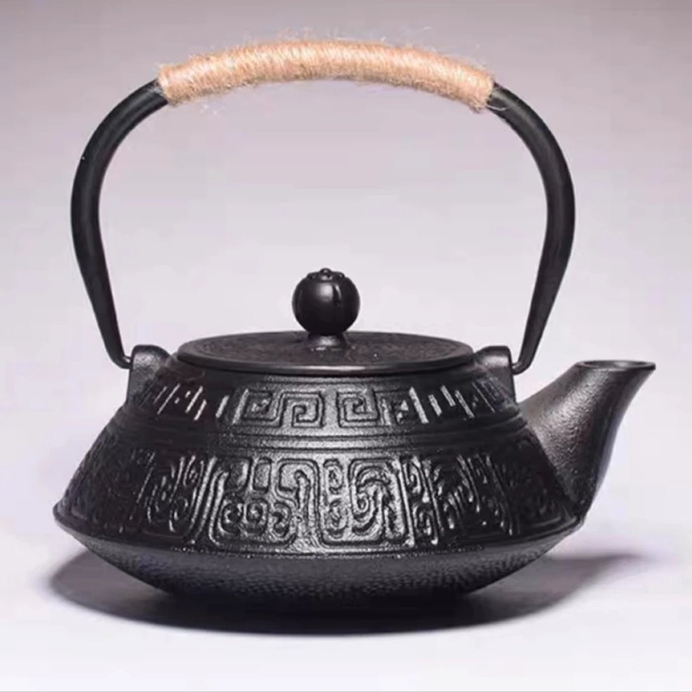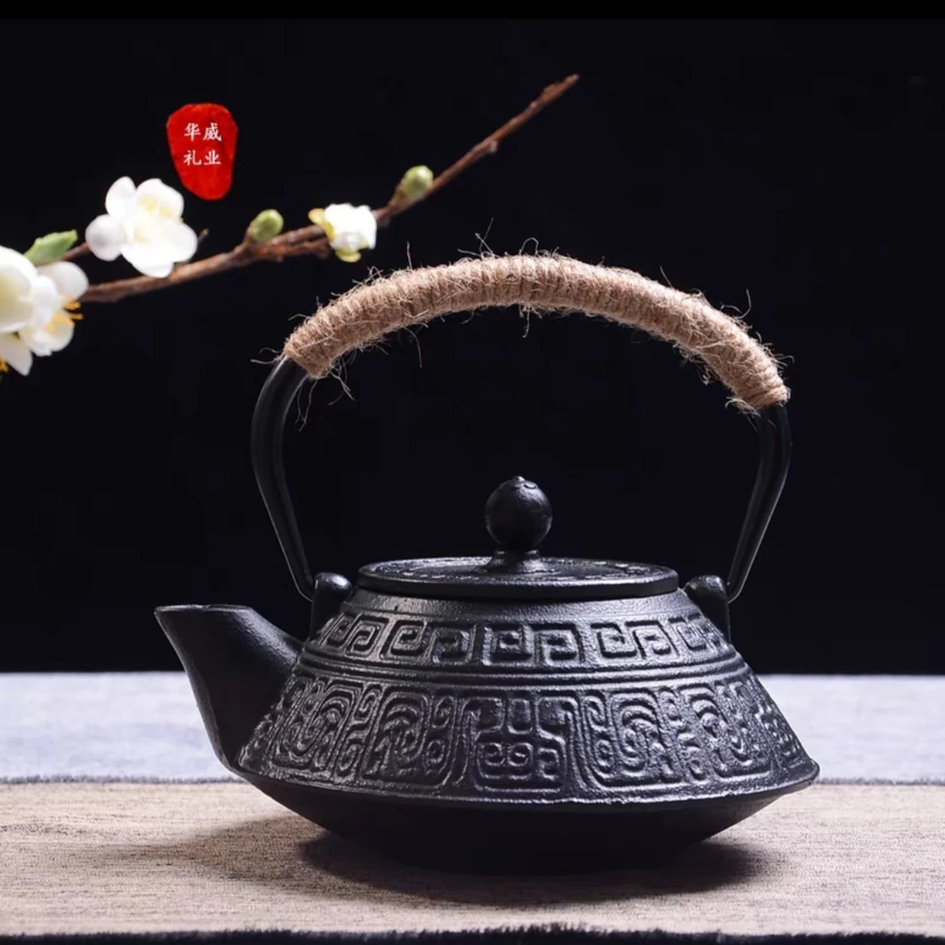 Esta tetera de hierro fundido destaca por su estética artística y cultural, inspirada en patrones orientales antiguos. Su cuerpo presenta grabados geométricos en relieve que evocan símbolos tradicionales, convirtiéndola en una pieza decorativa única y de alto valor visual. El acabado negro mate aporta elegancia y solidez, mientras que su base ancha y perfil bajo le dan estabilidad y presencia en cualquier ambiente.