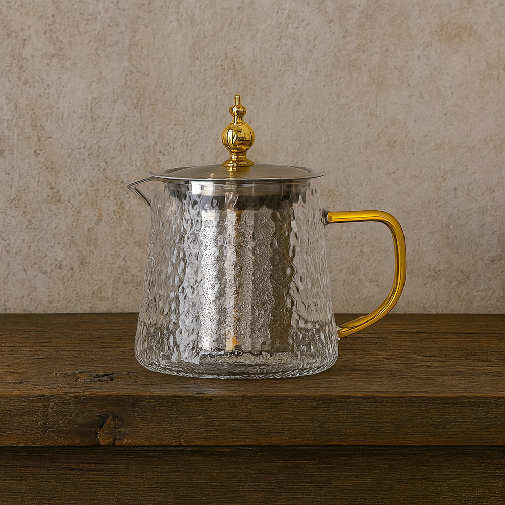 Esta pava de vidrio martillado combina lujo, modernidad y funcionalidad en una sola pieza. Su cuerpo texturado crea un efecto brillante que realza la apariencia de cada infusión, mientras que los detalles dorados del asa y la tapa aportan un estilo sofisticado ideal para mesas elegantes, casas de té y ambientes contemporáneos.