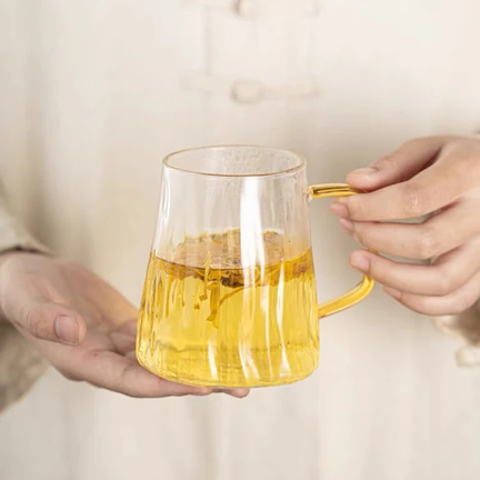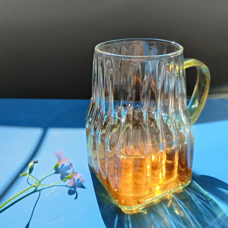 Jarra de vidrio transparente con diseño labrado en ondas verticales y asa color dorado combina elegancia y originalidad en una pieza funcional y muy atractiva. El relieve del vidrio crea un efecto visual sofisticado que realza el color de la bebida, mientras que el asa ámbar aporta un toque cálido y distintivo.