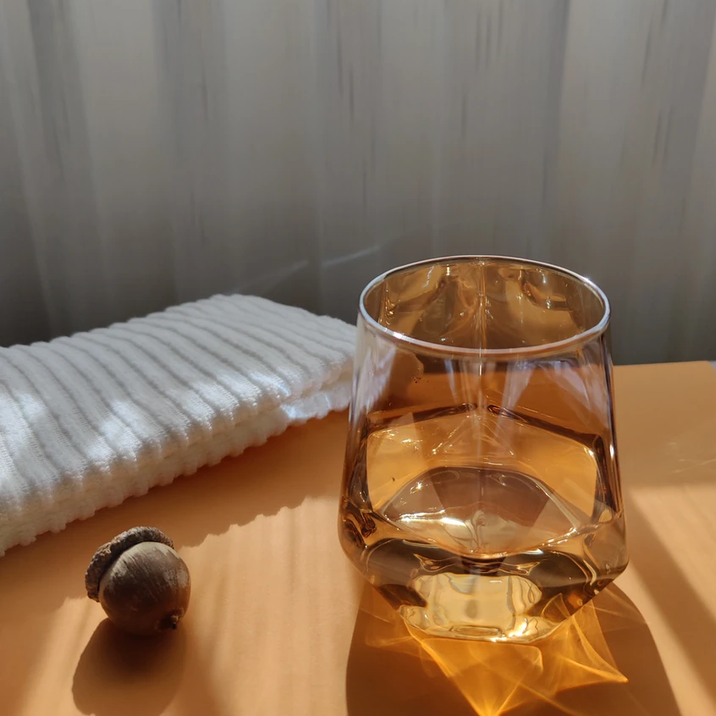 Vaso de vidrio borosilicato color ámbar de 318 mL combina diseño moderno, resistencia y una estética cálida que realza cualquier bebida. Su forma facetada y base sólida generan un atractivo juego de luces, convirtiéndolo en una pieza elegante y funcional.