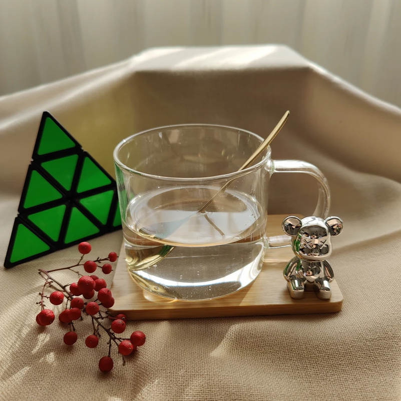 Taza de vidrio transparente con asa, incluye posavasos de madera con figura de oso y cucharita dorada