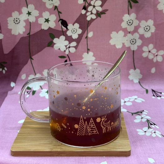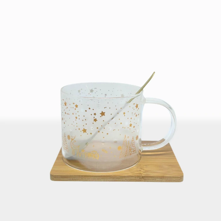 Taza de vidrio transparente con ilustración, ideal para café, té o infusiones. Incluye posavasos y cucharita dorada, formando un conjunto práctico y bien presentado.