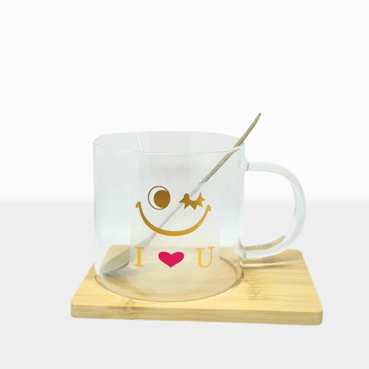 Taza de vidrio con diseño, incluye posavasos y cucharita dorada