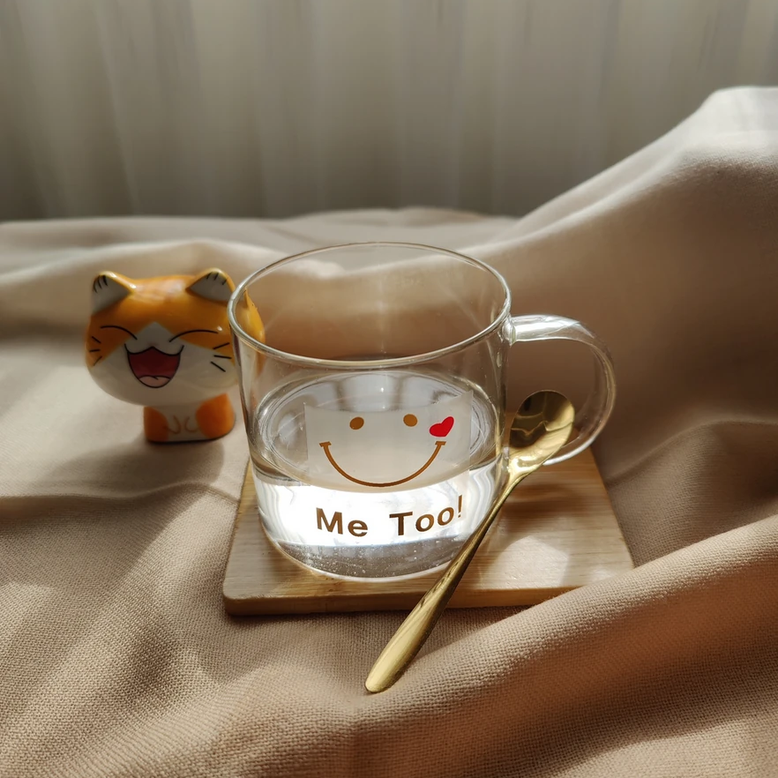 Taza de vidrio transparente con ilustración, ideal para café, té o infusiones. Incluye posavasos y cucharita dorada, formando un conjunto práctico y bien presentado.