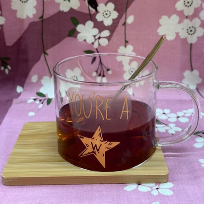 Taza de vidrio transparente con ilustración, ideal para café, té o infusiones. Incluye posavasos y cucharita dorada, formando un conjunto práctico y bien presentado.