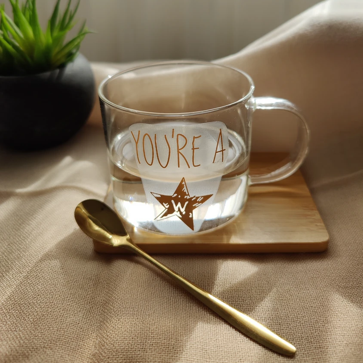 Taza de vidrio con diseño, incluye posavasos y cucharita dorada