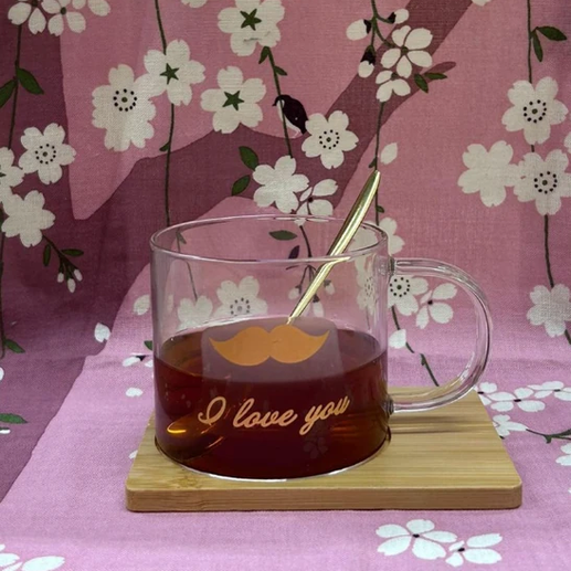 Taza de vidrio con diseño, incluye posavasos y cucharita dorada