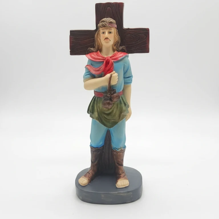 Imagen Gauchito Gil en resina Esta figura del Gauchito Gil en resina es una pieza cargada de simbolismo y devoción popular, muy buscada en todo el país. Su diseño detallado muestra al Gauchito de pie frente a la cruz, con colores vivos y terminaciones cuidadas que realzan su presencia en altares, hogares, comercios y espacios de oración.