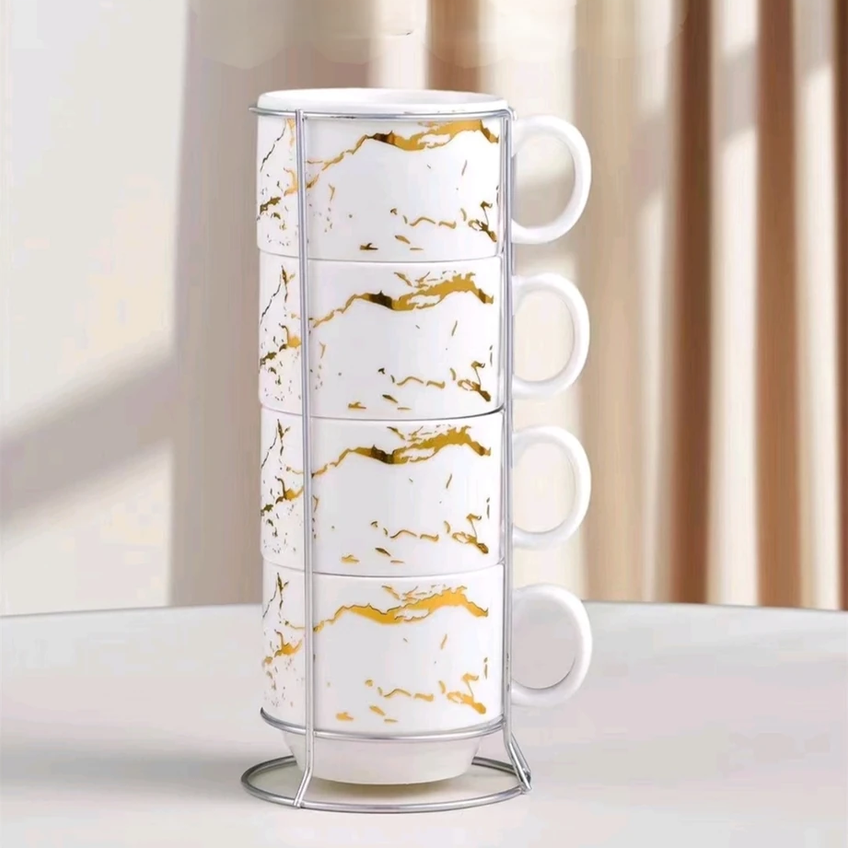 Set de 4 tazas de té de cerámica con elegante diseño marmolado con vetas doradas, ideal para acompañar mesas de té, café o desayunos. Su terminación esmaltada aporta un acabado delicado y moderno, fácil de combinar con distintos estilos de vajilla.