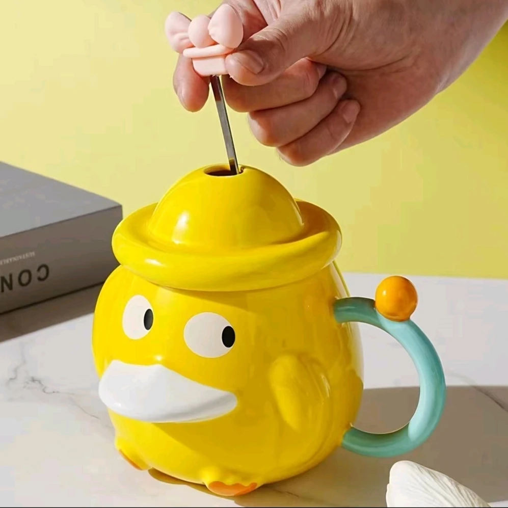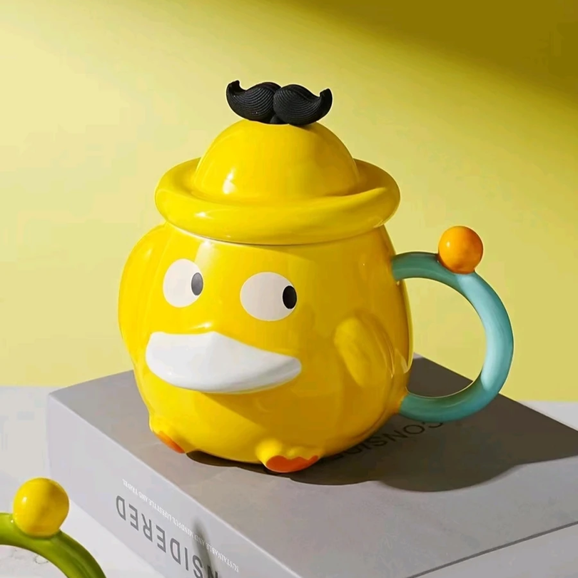 Taza de cerámica esmaltada con forma y expresión de pato, caracterizada por su cuerpo redondeado, pico en relieve y pequeños detalles modelados que le dan un aspecto divertido y llamativo. El acabado brillante realza el color amarillo intenso y los contrastes en el pico y la base.