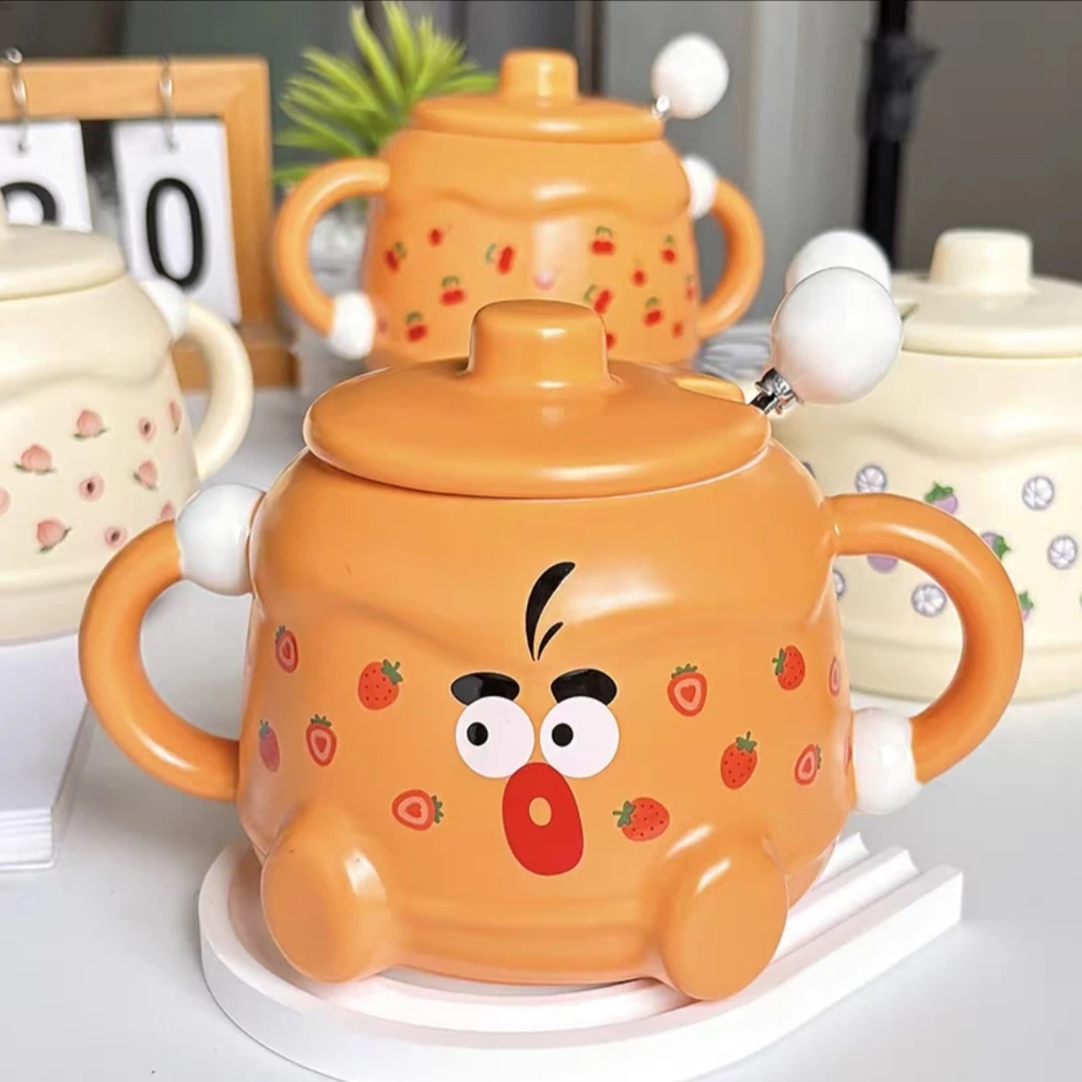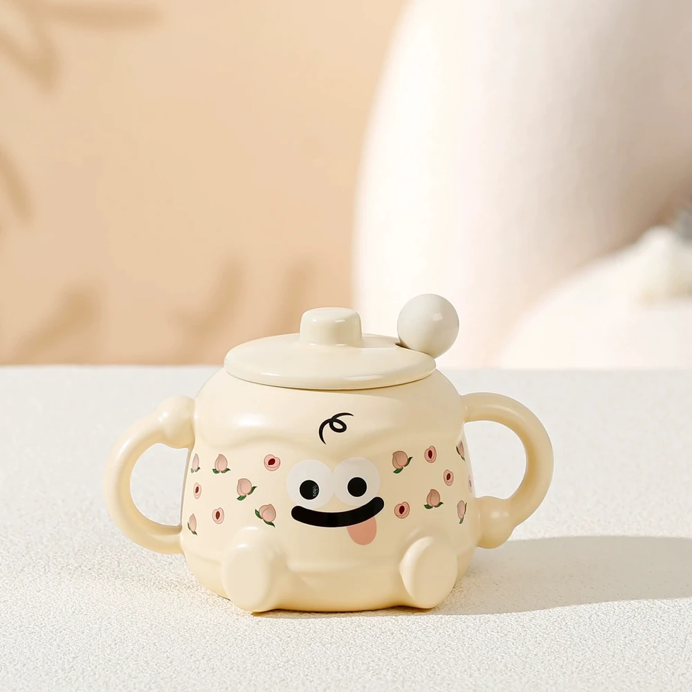 Taza de cerámica esmaltada con forma redondeada y caritas expresivas, decorada con ilustraciones de frutas en colores suaves y alegres. Disponible en cuatro diseños diferentes, cada uno con una expresión distinta que la hace muy linda y visualmente atractiva.