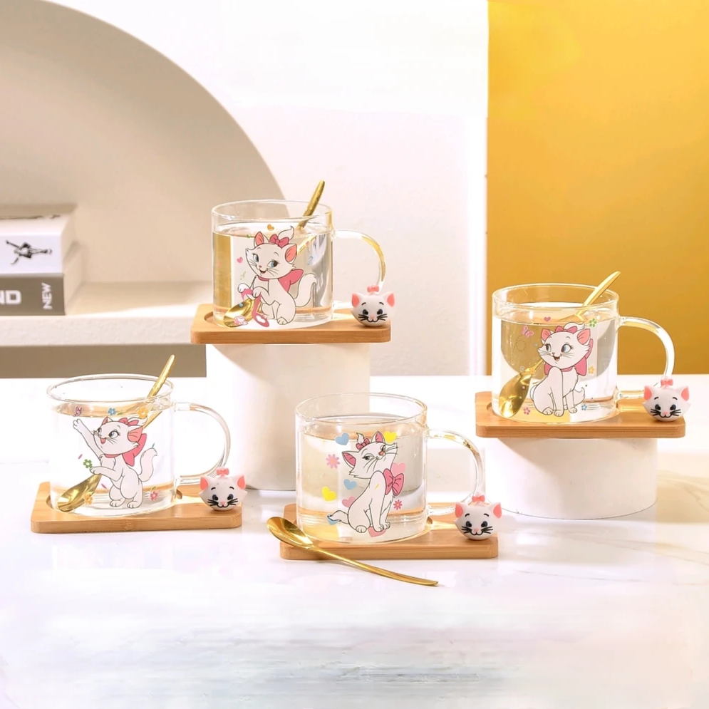 Taza elaborada en vidrio transparente con ilustraciones de la Gata Marie, distribuidas alrededor del cuerpo con detalles cuidados y colores suaves que realzan el diseño. Las gráficas presentan distintas expresiones del personaje, aportando un estilo encantador y decorativo.